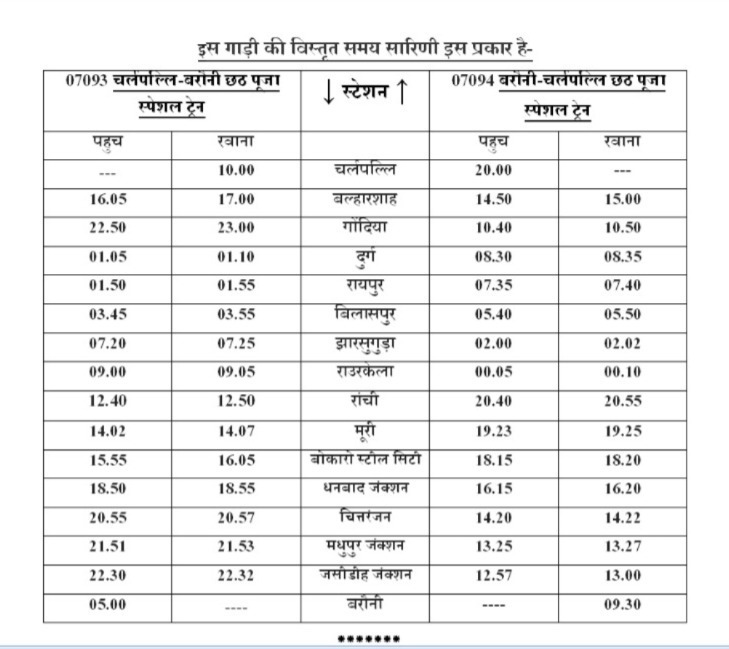 रेलवे के अनुसार, ट्रेन संख्या 07093 चर्लपल्लि–बरौनी छठ पूजा स्पेशल 25 अक्टूबर 2025 को चर्लपल्लि से रवाना होगी. वहीं, वापसी में 07094 बरौनी–चर्लपल्लि स्पेशल ट्रेन 27 अक्टूबर 2025 को बरौनी से प्रस्थान करेगी. दोनों दिशाओं में यह ट्रेन गोंदिया, दुर्ग, रायपुर और बिलासपुर मार्ग से चलेगी.