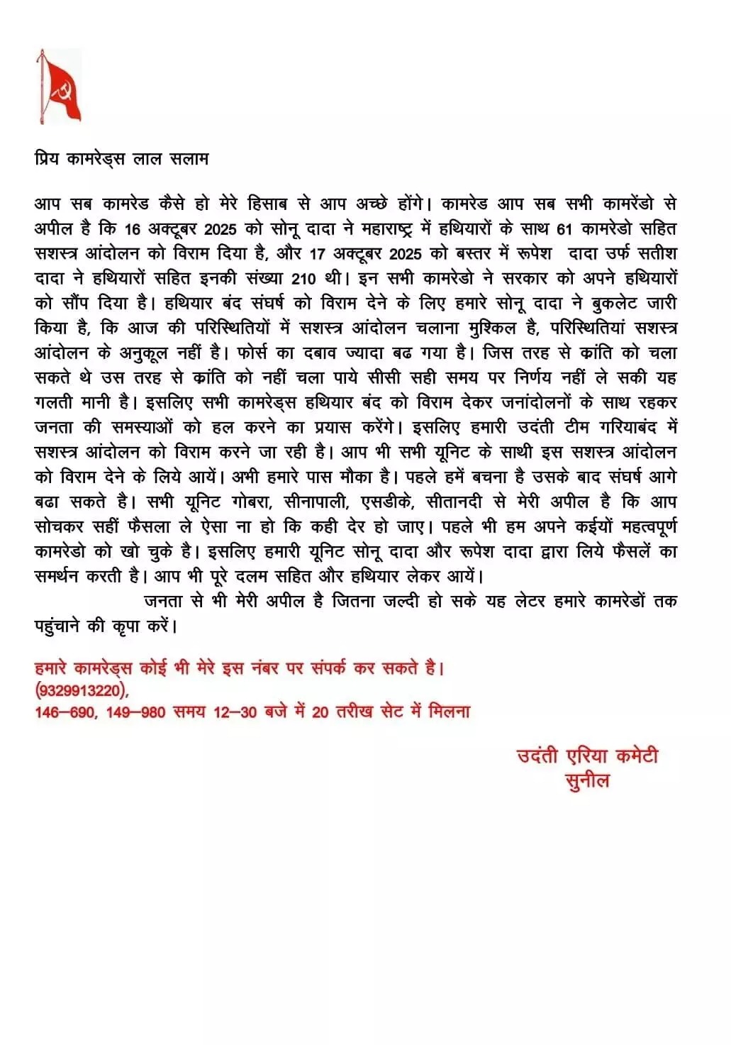 वायरल पत्र जरियाबांध से सामने आया है जिसमें लिखा है. आप सब कॉमरेड कैसे है.इसके आगे इसमें जिक्र किया गया की 16 अक्टूबर को सेंट्रल कमिटी सदस्य सोनू दादा ने महाराष्ट्र में 61 साथियों के साथ हथियार डाल दिया और सशस्त्र आंदोलन को विराम दिया है. इसके बाद 17 अक्टूबर को 210 लोगों के साथ सतीश उर्फ रूपेश ने हथियार डाल दिया. इसमें बताया गया कि सोनू दादा ने एक बुक लेट जारी किया है. जिसमें अपील की है हथियार के साथ आंदोलन संभव नहीं है. संघर्ष जारी रखने के लिए हमें हथियार डालना होगा.