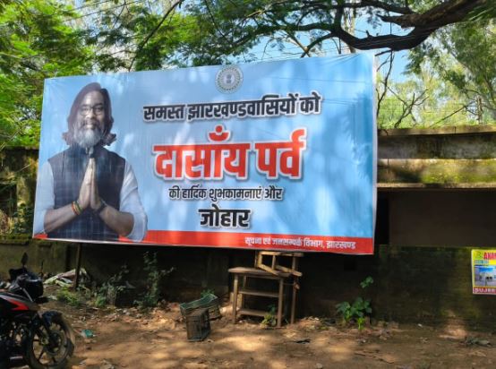 दरअसल शरदीय नवरात्र का त्यौहार चल रहा है. लोग देवी दुर्गा की आराधना में लीन हैं. एक दूसरे को दुर्गा पूजा की बधाई और शुभकामना दे रहे है. सूचना एवं जनसंपर्क विभाग द्वारा सीएम हेमंत सोरेन की तस्वीर लगा होर्डिंग दुमका शहर में लगाया गया जिसमें प्रदेश वासियों को दुर्गा पूजा और दशहरा की शुभकामना दी गई है. इस होर्डिंग पर संताल समाज के लोगों ने आपत्ति जताई. उनका कहना है कि दुर्गा पूजा के समय ही संताल समाज का दासांय पर्व मनाया जाता है जो गुरु शिष्य परंपरा को दर्शाता है. सीएम सभी धर्म और समुदाय के होते है. इसके बाबजूद PRD के होर्डिंग में दुर्गा पूजा और दशहरा की शुभकामना दी गई जबकि दा सांय पर्व का जिक्र भी नहीं है वह भी तब जब सीएम हेमंत सोरेन संताल आदिवासी है.