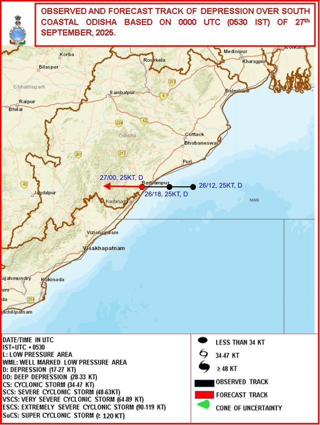 दक्षिण ओडिशा और उत्तरी आंध्र प्रदेश के तटों से दूर, उत्तर-पश्चिम और उससे सटे पश्चिम-मध्य बंगाल की खाड़ी पर बना निम्न दबाव का क्षेत्र पिछले छह घंटों में 12 किमी प्रति घंटे की गति से लगभग पश्चिम की ओर बढ़ गया है. अगले 24 घंटों में, इसके दक्षिण ओडिशा और छत्तीसगढ़ होते हुए पश्चिम की ओर बढ़ने और धीरे-धीरे कमजोर होने की उम्मीद है.