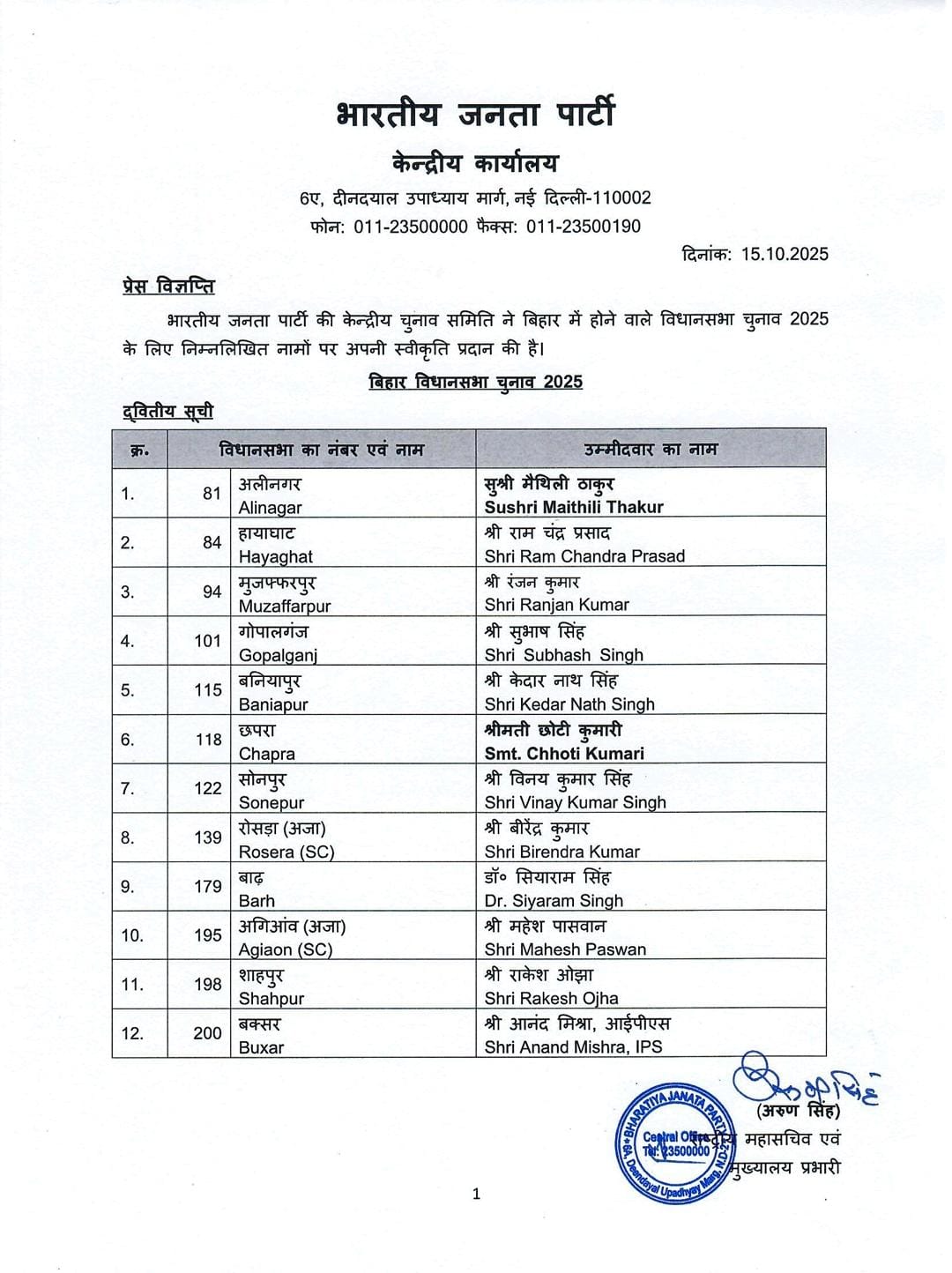 TNP DESK- बिहार विधानसभा चुनाव को लेकर बीजेपी ने अपनी दूसरी लिस्ट जारी कर दी है. दूसरी लिस्ट में 12 उम्मीदवारों के नाम की घोषणा की गई है. बीजेपी की दूसरी लिस्ट में लोकगायिका मैथिली ठाकुर का भी नाम शामिल है. बीजेपी ने मैथिली ठाकुर को अलीनगर से टिकट दिया गया है. मैथिली ठाकुर की लोकप्रियता को देखते हुए उन्हें इस सीट से टिकट दिया गया है.