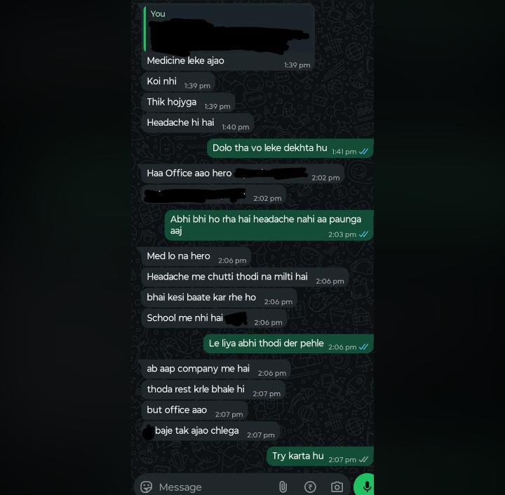 दरअसल यह पूरा मामला तब शुरू हुआ जब एक एम्प्लॉय को सर में दर्द की शिकायत हुई, उसने यह वजह बता कर अपने बॉस से छुट्टी मांगी. लेकिन बॉस ने छुट्टी देने से मना कर दिया, जिसके बाद कर्मचारी ने अपने बॉस से हुई बात और व्हाट्सएप चैट को वायरल कर दिया. जो सोशल मीडिया पर वायरल हो रहा है. व्हाट्सएप चैट में कर्मचारी अपने बॉस को सर दर्द की वजह बता कर ऑफिस ना आने की बात कहता है और छुट्टी मांगता है. इसके जवाब में बॉस बहुत ही हैरान करने वाली बात कहता है वह कहता है कि सर दर्द में छुट्टी कौन लेता है दवा खाओ और ऑफिस आ जाओ.